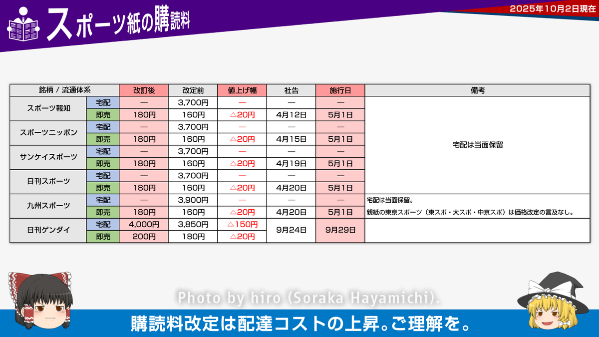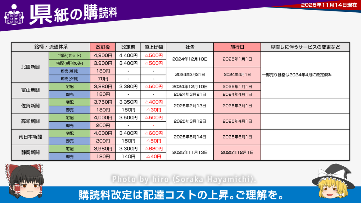 新聞の購読料改定、または頒布・供給体制の見直しを、新聞社の社告を通じて正式に公表された情報をもとにまとめていく。2024年実施分は↓の記事を参考にどうぞ。